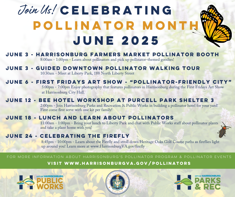 Pollinator spaces that city staff have installed and managed are listed in our Harrisonburg Pollinators Guide.  Check out the story map to see all the new pollinator spaces we added this year.