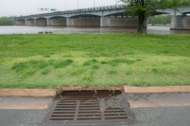 Stormwater flowing into storm drain along roadway. - What is the problem with stormwater runoff?